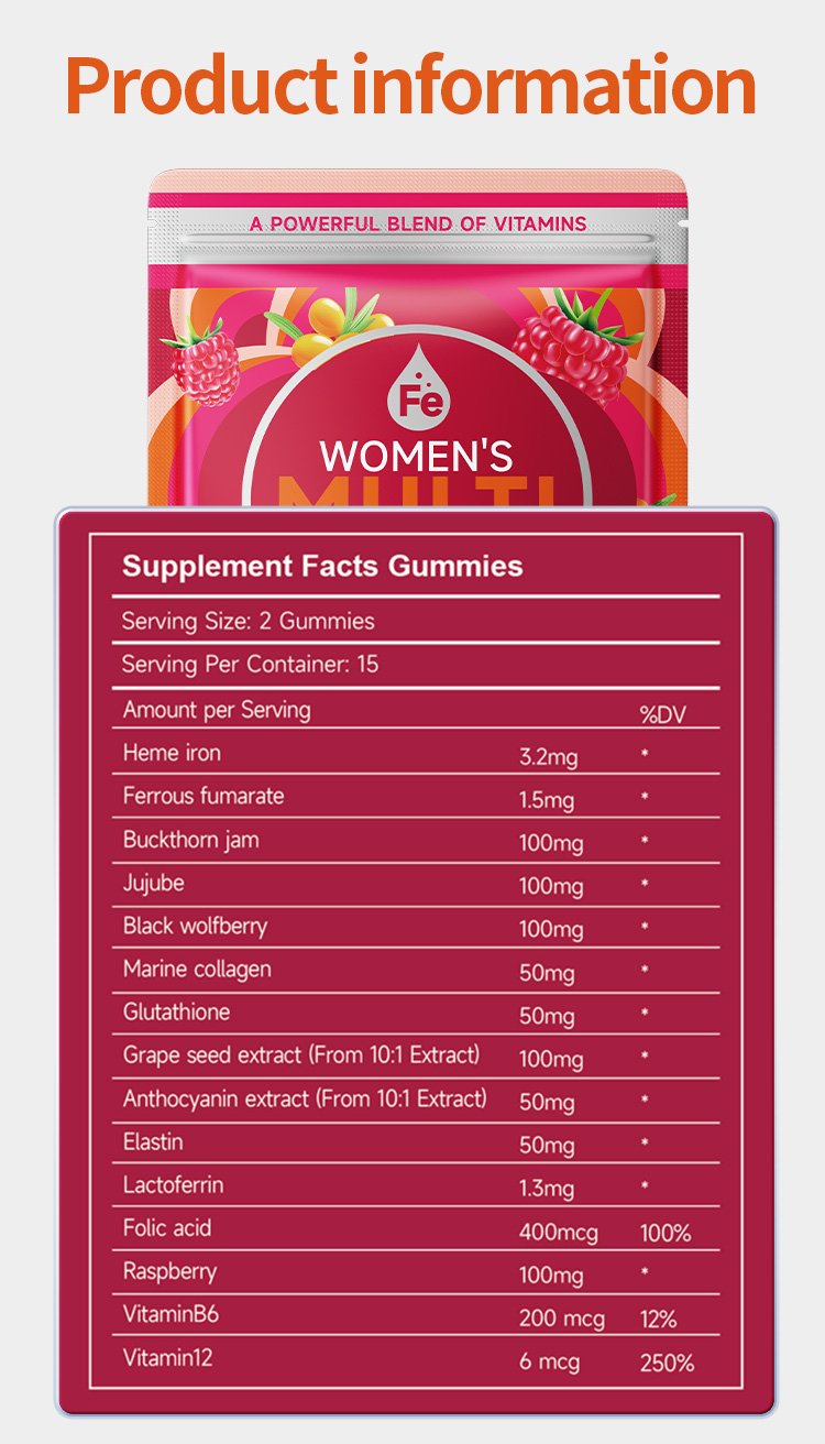 Heme iron, fish collagen, grape seed extract, anthocyanin extract, ferrous fumarate, sea buckthorn pulp, jujube, black goji berry, glutathione, elastin, folic acid, raspberry, vitamin B6, vitamin B12